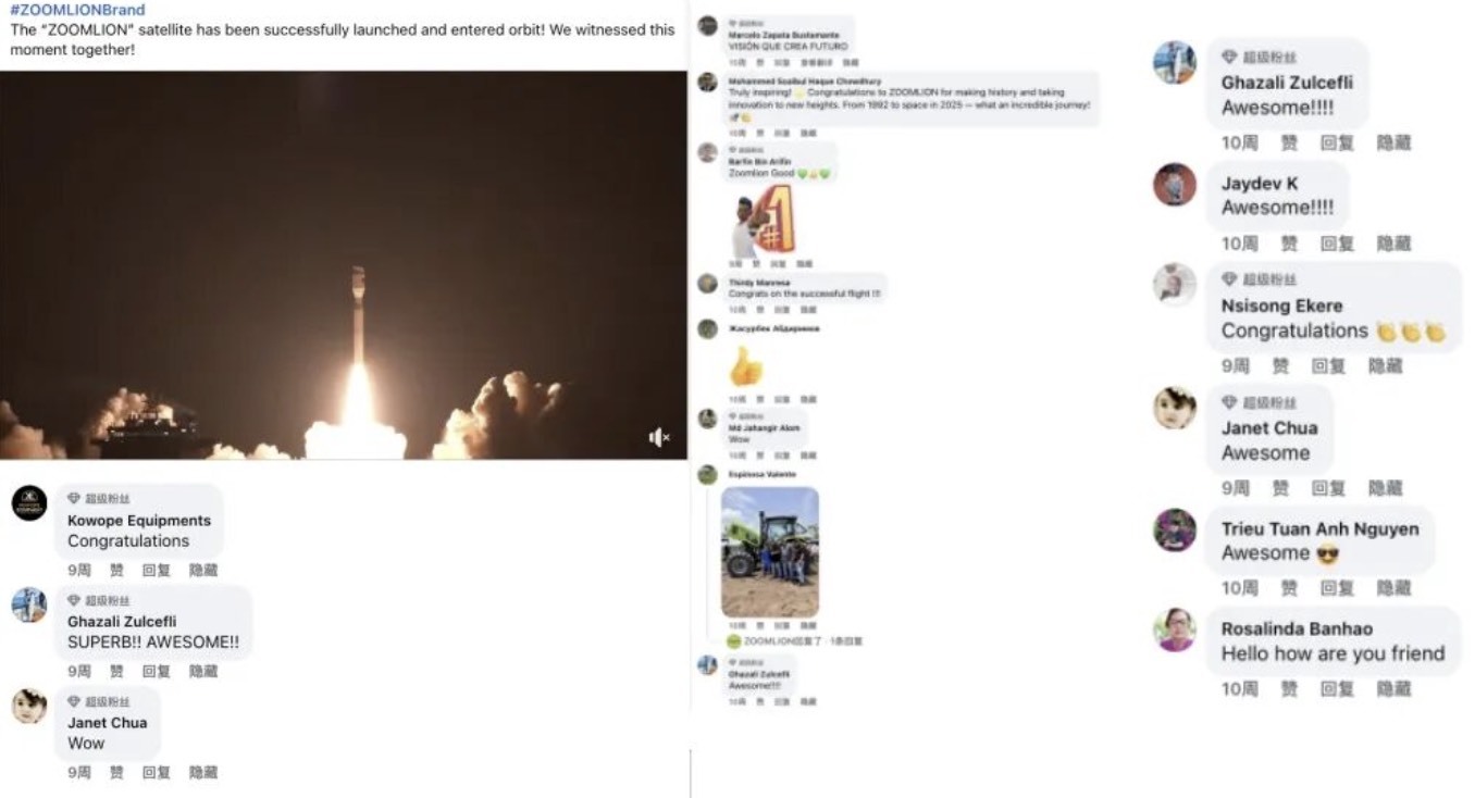 ▲海外社媒平台粉丝点赞“中联重科号”卫星成功发射
