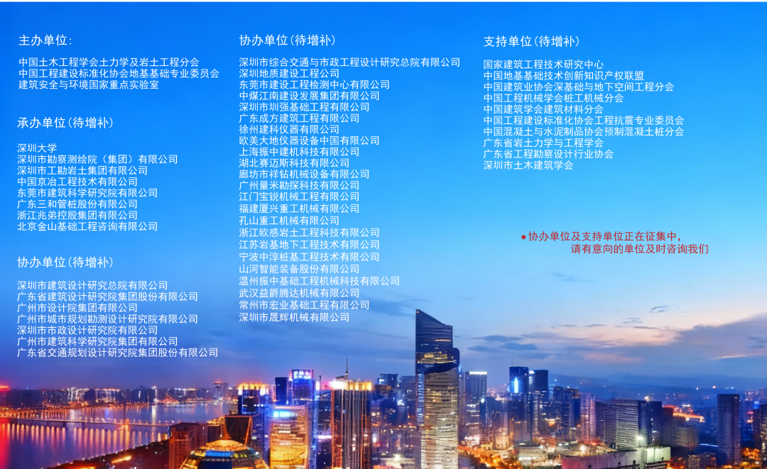第十六届桩基工程学术会议(原全国桩基工程学术会议),拟定于2025年11月24-26日在深圳国际会展中心洲际酒店举办,会议由中国土木工程学会土力学及岩土工程分会、中国工程建设标准化协会地基基础专业委员会以及建筑安全与环境国家重点实验室共同主办,深圳市勘察测绘院(集团)有限公司、北京金山k1体育咨询有限公司等单位承办。届时将邀请行业内知名专家学者作特邀报告、大会报告与专题报告,全方位呈现桩基工程领域的最新研究成果与先进工程应用技术。会议期间特设专业展示区域,集中展示前沿研究成果、创新工程技术及新设备、新材料、新仪器等,为参会者打造多维度学术交流空间。组委会热忱邀请本领域的专家、学者、工程技术人员、在校研究生积极参与,共同探讨与交流桩基工程领域最新成果和技术!