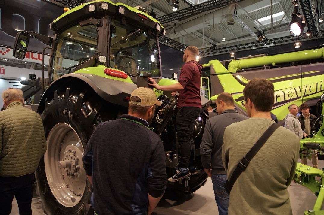 上午9点,在5号馆D37展台,首次亮相全球最大农机展的中联重科展区已是人流如织,前来观摩、咨询的嘉宾络绎不绝。四款高端新能源主机产品正式向全球专业观众亮相:分别为DV3504、DQ2604、DL1604三款混动拖拉机,以及一款480马力的混动收割机H7-600E。