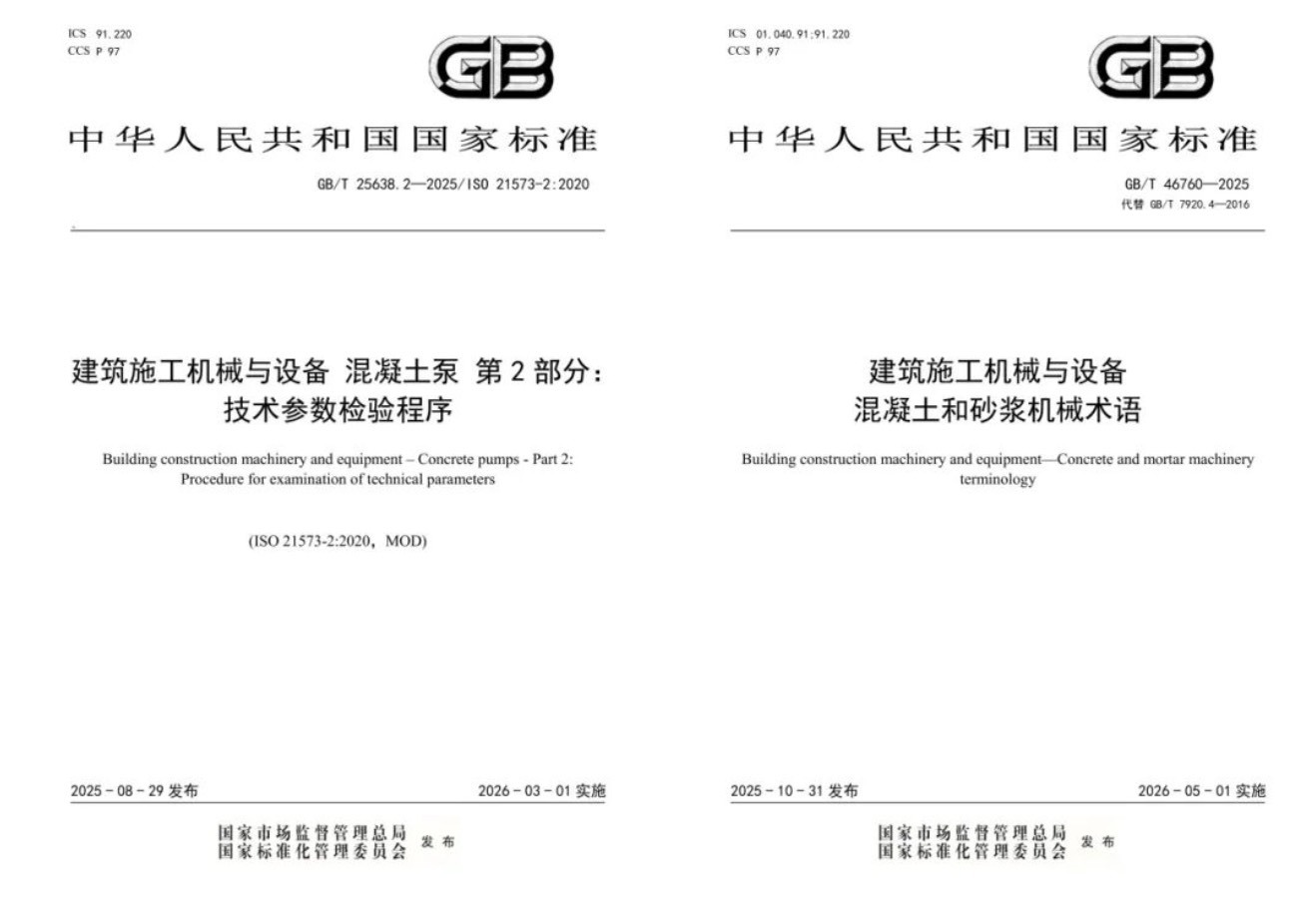 中联重科此次牵头编制的两项国家标准分别是GB/T 25638.2-2025《建筑施工机械与设备 混凝土泵 第2部分:技术参数的检验程序》和GB/T 46760-2025《建筑施工机械与设备 混凝土和砂浆机械术语》。